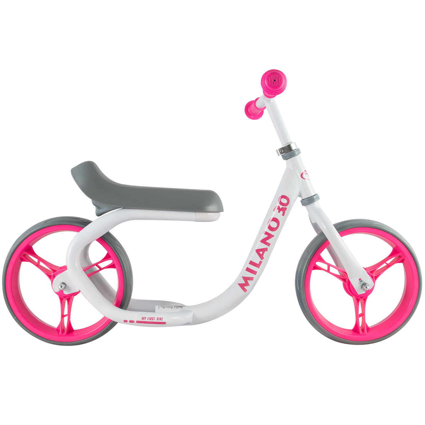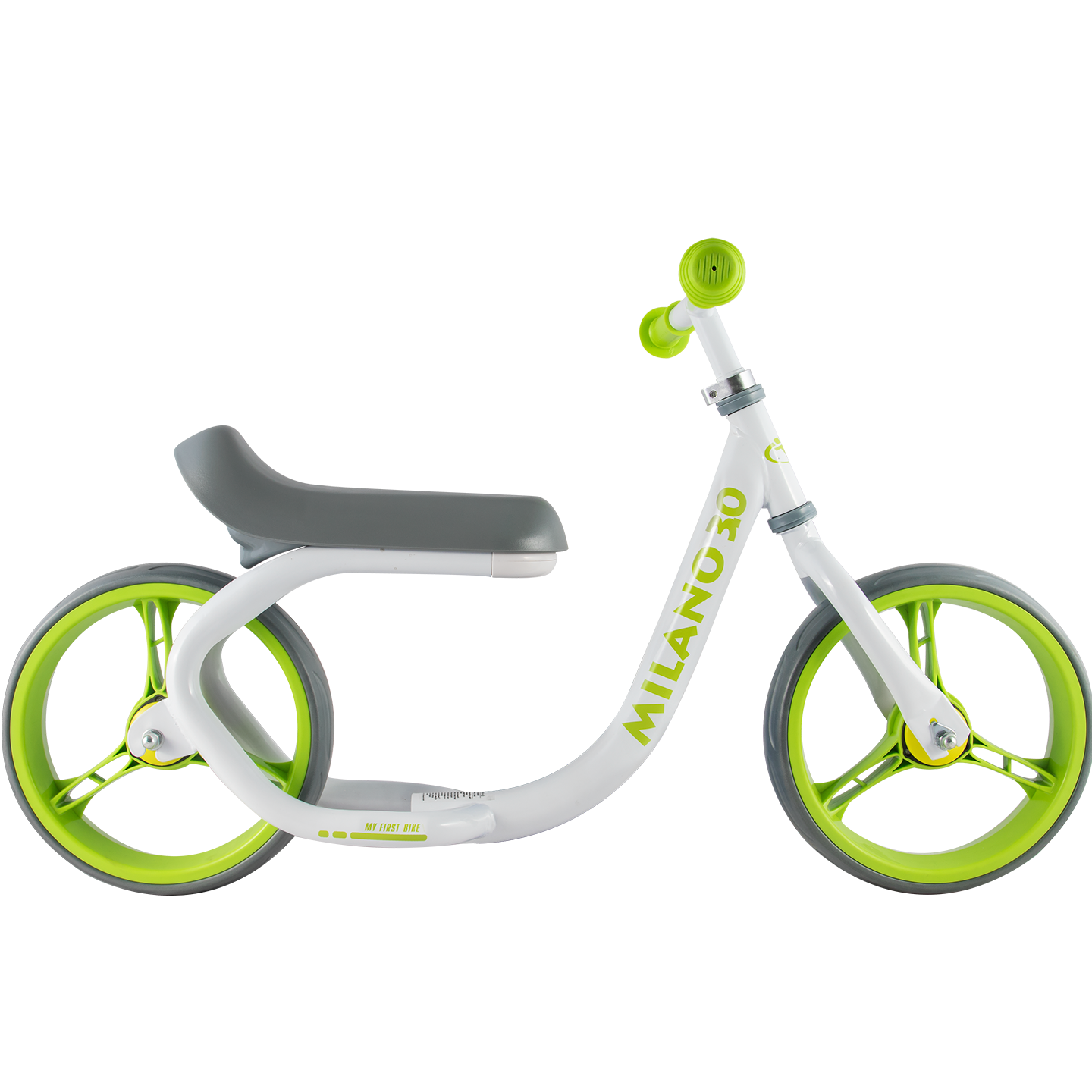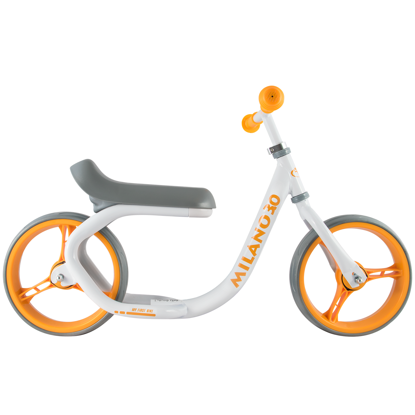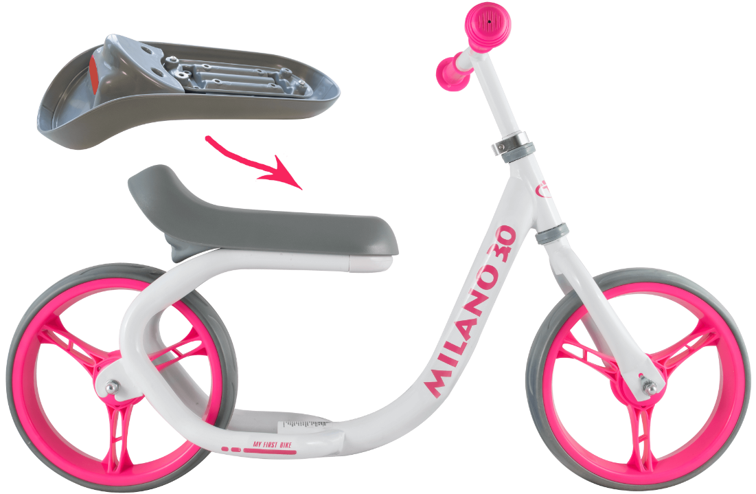 В линейке Milano этот беговел чуть больше остальных по габаритам, поэтому хорошо подойдет малышам покрупнее. Особенностью модели является удобное и широкое анатомически выверенное седло для комфортной посадки малыша. Высота сидения регулируется в двух положениях (32 и 34 см от поверхности). Для этого необходимо отсоединить пластиковый крепежный элемент под сидением и перевернуть его (подробнее смотрите на фото в галерее). На задней части сидения установлен светоотражающий элемент. Высота руля регулируется в диапазоне от 46 до 54 см от поверхности.
